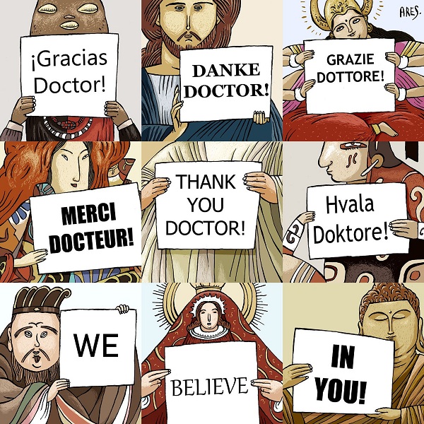 ¨Recibieron más de 7000 obras de numerosos países. Participé con dos caricaturas y obtuve el Grand Prix con una en la que muestro, de un modo bastante singular, el agradecimiento de todos en el mundo al personal médico que está y estuvo en la primera línea de esta batalla”.